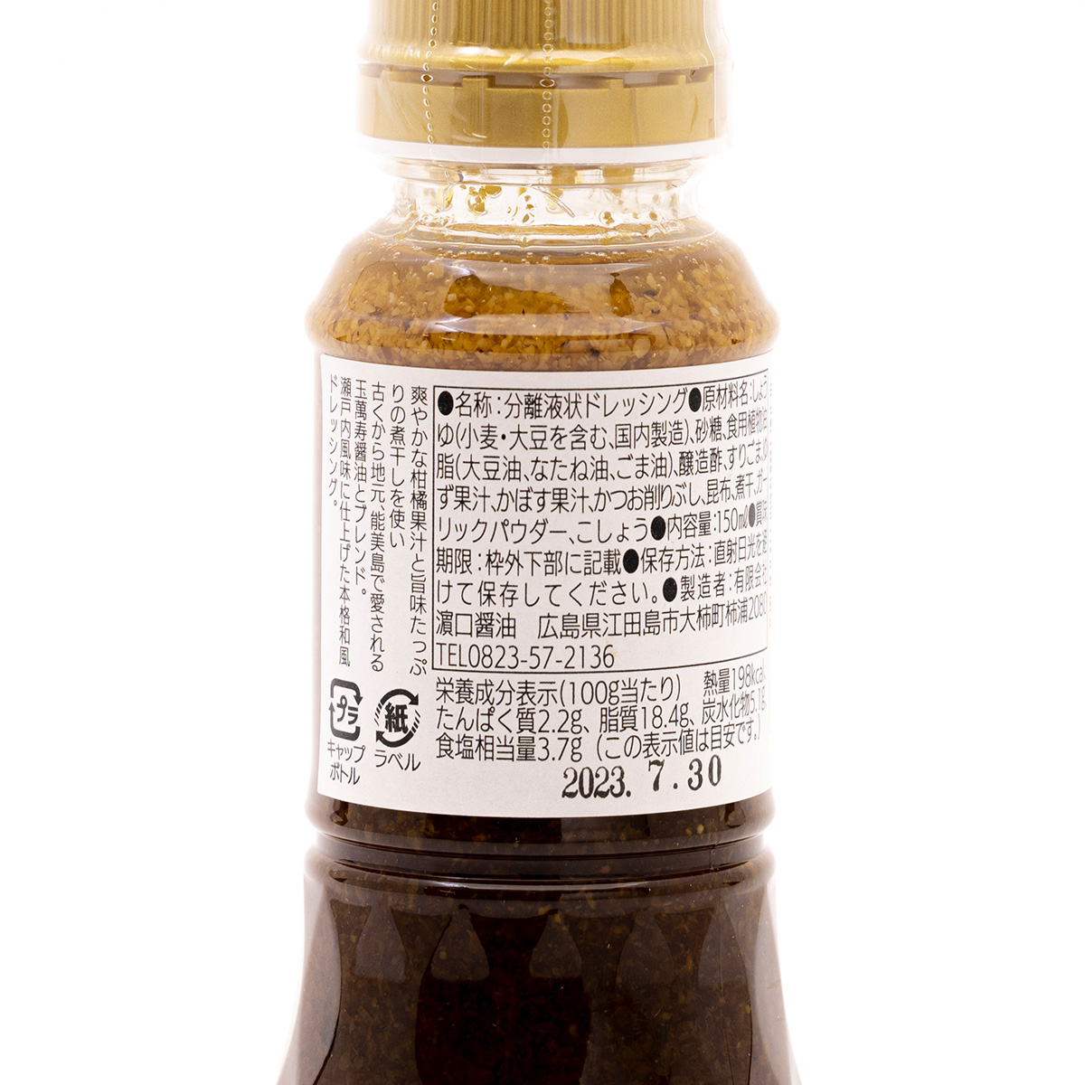 | 原材料名 | しょうゆ(小麦・大豆を含む、国内製造)砂糖、食用植物油脂(大豆油、なたね油、ごま油、醸造酢、すりごま、ゆず果汁、かぼす果汁、かつお削りぶし、昆布、煮干、ガーリックパウダー、こしょう | |